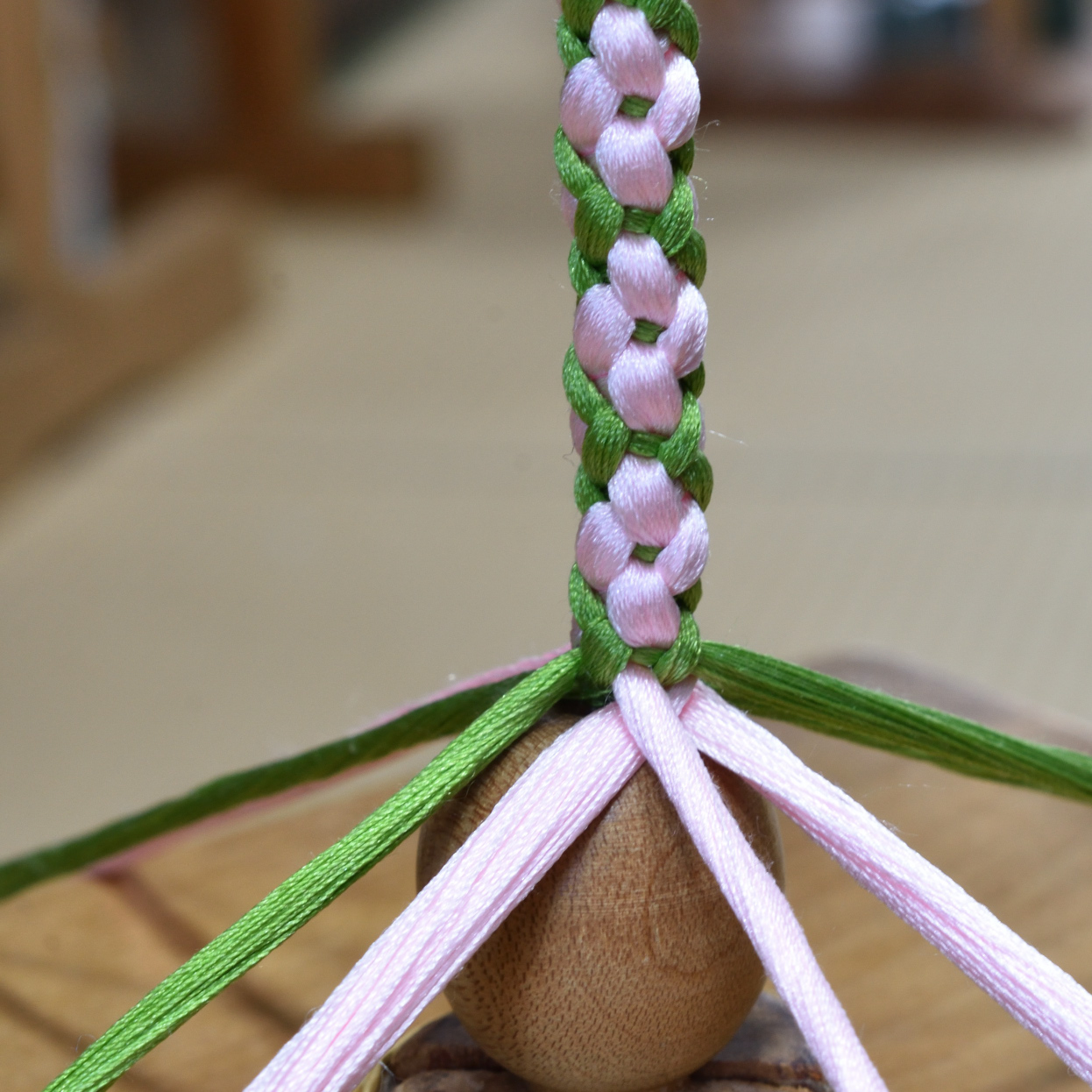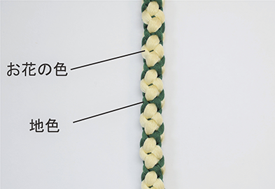 今回、皆様に体験していただく帯締めの組み方は、弊社でも人気のある帯締めの一つで「花みずき」と呼んでいる組み方になります。角台と呼ばれる組台を使用して組み上げられるこちらの組紐は、8玉のシンプルな構造ながらも糸のバランスや手順などが上手に工夫されています。組み上げていく中で現れるかわいいお花の柄と木玉の奏でるリズムに心が癒されることと思います。